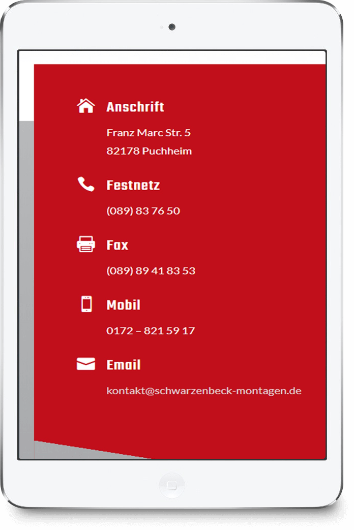 So erreichen Sie Uns Kontakt Anschrift Franz Marc Str. 5 82178 Puchheim Festnetz (089) 83 76 50 Fax (089) 89 41 83 53 Mobil 0172 - 821 59 17 Email kontakt@schwarzenbeck-montagen.de So finden Sie Uns